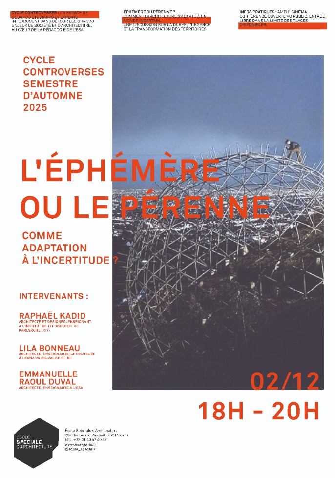 Dans le cadre de ses conférences publiques, l’École Spéciale d’Architecture propose :