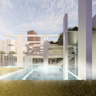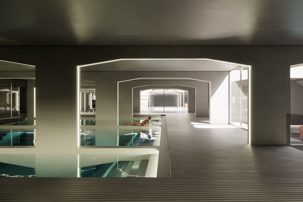Au centre, un patio élargi devient source de lumière, de ventilation naturelle et de fraîcheur grâce à sa végétation. Les bassins s’insèrent dans la trame du béton, créant une atmosphère calme et enveloppante, presque souterraine.