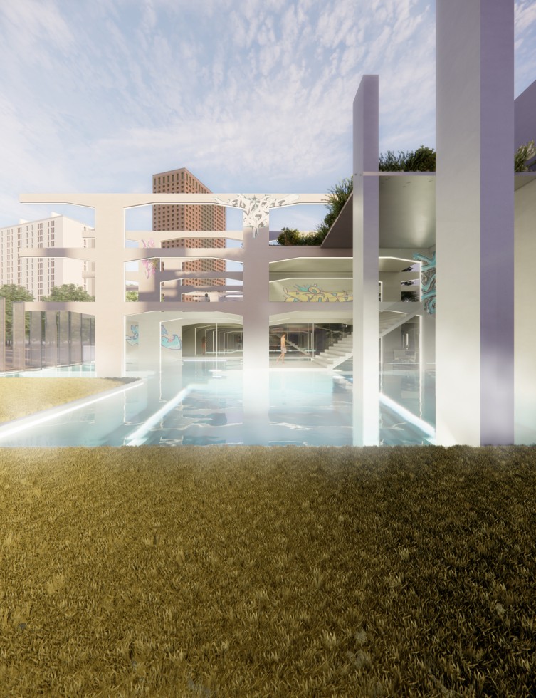 Le projet REX25-091 imagine des bains publics au sein du Mausolée, ancien hypermarché en béton armé construit en 1967 à la Porte de la Villette.