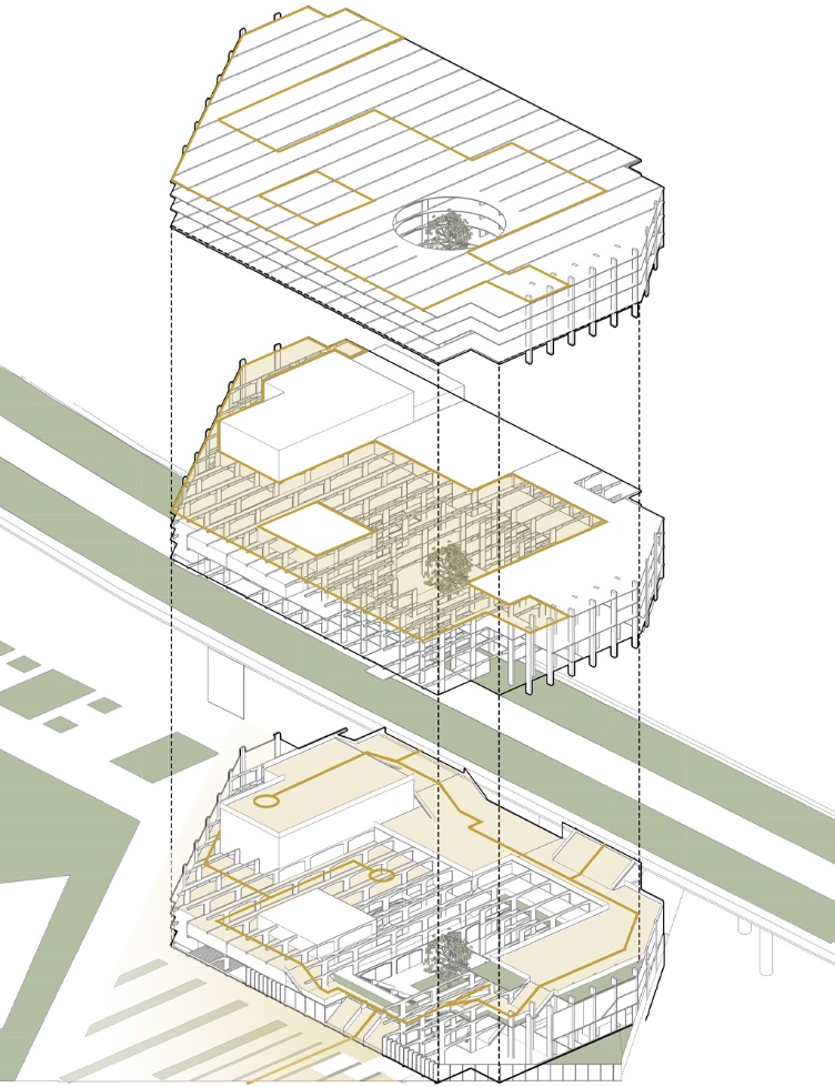 Enfin, une promenade sur la toiture relie le parc de la Porte de la Villette au boulevard périphérique transformé en boulevard urbain : un lieu de soin, de lien et de réconciliation entre la ville et ses marges.