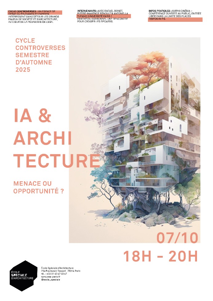 Animée par Antonella Tufano (Université Paris 1 Panthéon-Sorbonne), Pierre-Maxence Renoult (architecte-ingénieur, enseignant à l’ESA) et Rafael Bonet (architecte praticien et enseignant), cette table ronde a permis d’interroger la place de l’humain, du savoir et de la création dans l’ère de l’intelligence artificielle.