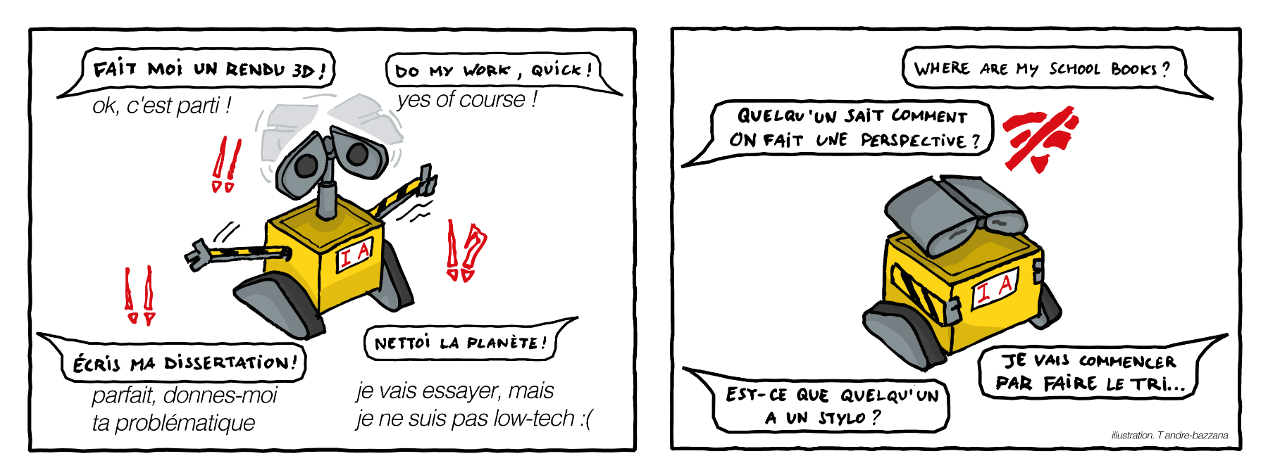 À la suite de cette controverse, les étudiants de Master de l’École Spéciale d’Architecture ont prolongé la réflexion à travers une série de textes analytiques autour des enjeux éthiques, pédagogiques, politiques et professionnels de l’intelligence artificielle.