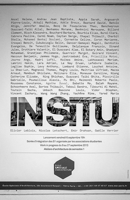 La Galerie de l’École Spéciale change d’affectation, elle devient le lieu d’un quadruple atelier d’architecture, les étudiants de Semestre 1 et leurs enseignants se retrouvent ainsi au centre de l’École et le processus pédagogique se met en scène.
