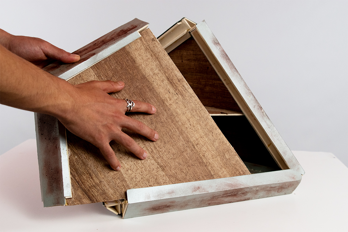 Le projet est conçu à partir de 2 modules pouvant accueillir 2 à 4 occupants, l’un vertical et l’autre horizontal. Chacun d’eux et constitué de 7 panneaux en bois glissés dans une ossature en acier Corten et reposant sur une structure métallique qui prends appui dans le sol. La répartition des espaces intérieurs est simple : le niveau bas accueille la pièce de vie et la salle d’eau et le niveau haut les chambres. Le module vertical est accessible par le bas via une trappe et une échelle. Le module horizontal est accessible par le côté via une extension du sol.