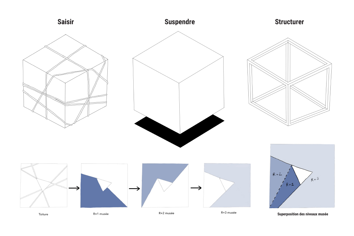 L’objectif du musée est de valoriser et dynamiser le quartier de la Porte de La Chapelle dont l’environnement défavorisé est inhospitalier. La programmation culturelle aurait alors pour ambition d’attirer un autre type de fréquentation et de favoriser la mixité sociale du quartier. Pour y parvenir, la visite du musée se doit d’être une expérience inédite : les salles d’expositions sont abritées dans un volume cubique et opaque en lévitation au sein de la structure existante en béton. L’accès se fait par une circulation extérieure qui s’enroule autour du parallélépipède. Le visiteur appréhende alors une autre manière de parcourir un musée et de découvrir les œuvres exposées.